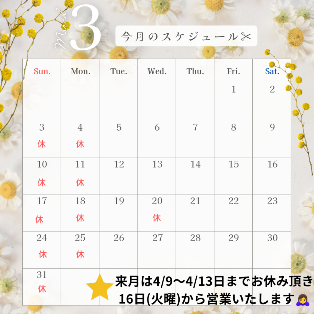3月のスケジュール✍︎Click👈”by MiRu72@cp1on 投稿日: 2024年3月5日2024年3月5日 気がつけば…3月ですね!🫣 今月もよろしくお願いします!🤗 3月・4月は卒業式・入学式シーズンなのでご予約が早く埋まります!お早めのご予約お願いします🙏 ☆3月の土曜日はご予約が既にいっぱいとなっております!ご了承ください🙇🏻♀️”